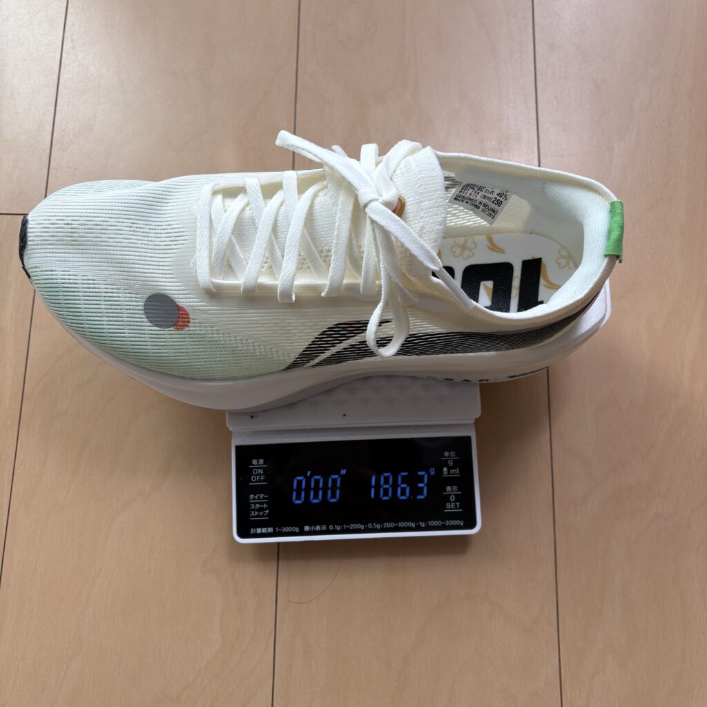 重さは実測で186g 昨今のレースシューズでは平均的な重さかと思います。